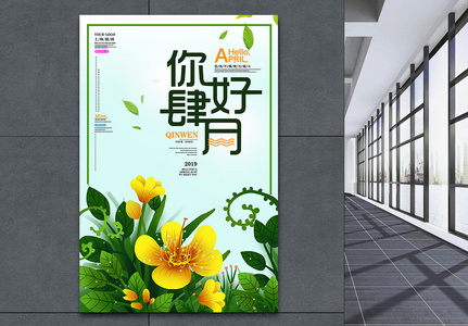 绿色黄花山水卡通风景4月你好海报背景免费下载 觅知网